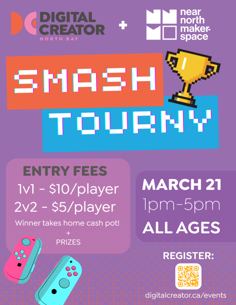 Digital Creator North Bay and the Near North Makerspace are hosting a Super Smash Bros. Tournament, Saturday, March 2st, starting at 1pm. This tournament is open to players of all ages! We will collect cash entry fees, and the winner and winning team will take home the pool of cash. There will also be other cool prizes. We will also have pop and chips available to purchase for $2 each.