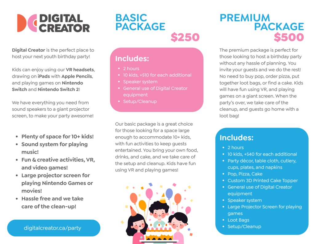 Digital Creator is the perfect place to host your next youth birthday party! Kids can enjoy using our VR headsets, drawing on iPads with Apple Pencils, and playing games on Nintendo Switch and Nintendo Switch 2! We have everything you need from sound speakers to a giant projector screen, to make your party awesome!